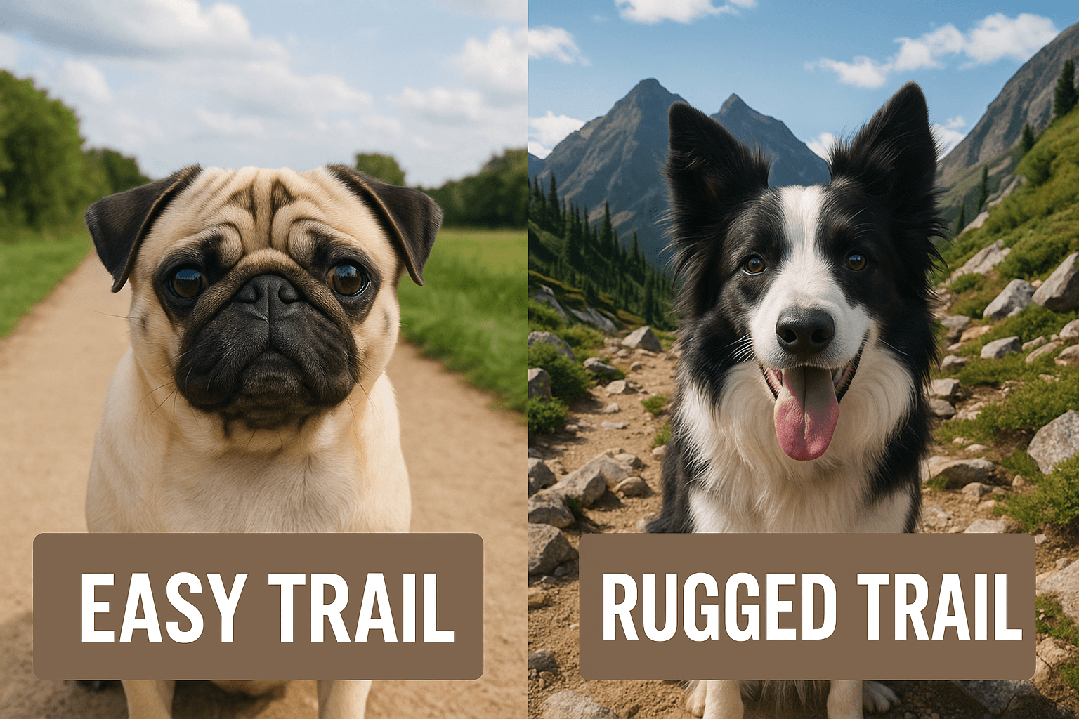 A Pug on an easy flat trail and a Border Collie on a rugged mountain path, illustrating dog hiking safety in Colorado by choosing trail types that fit each breed’s needs.
