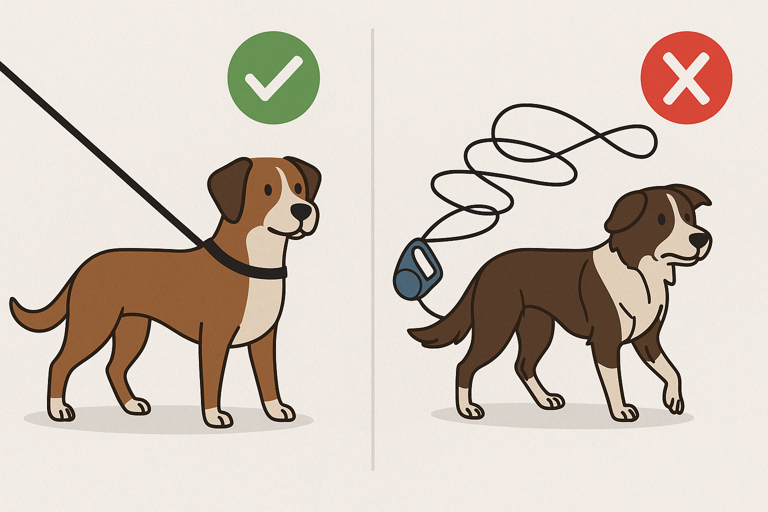 Side-by-side illustration showing proper dog hiking safety in Colorado: a dog on a standard 6-foot leash with a green checkmark versus a tangled retractable leash with a red X.