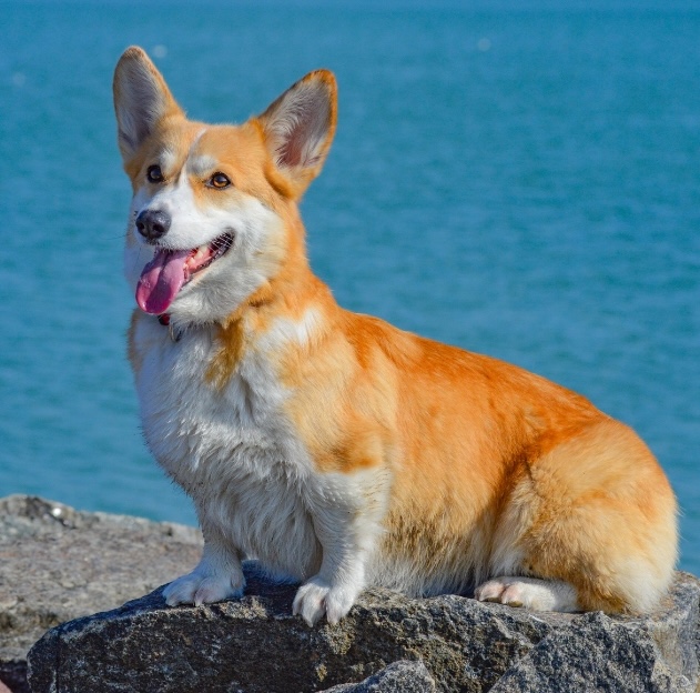 A happy Corgi sits proudly on a rock overlooking the water, illustrating how varied and adventurous exercise for dog anxiety can build a dog’s confidence.